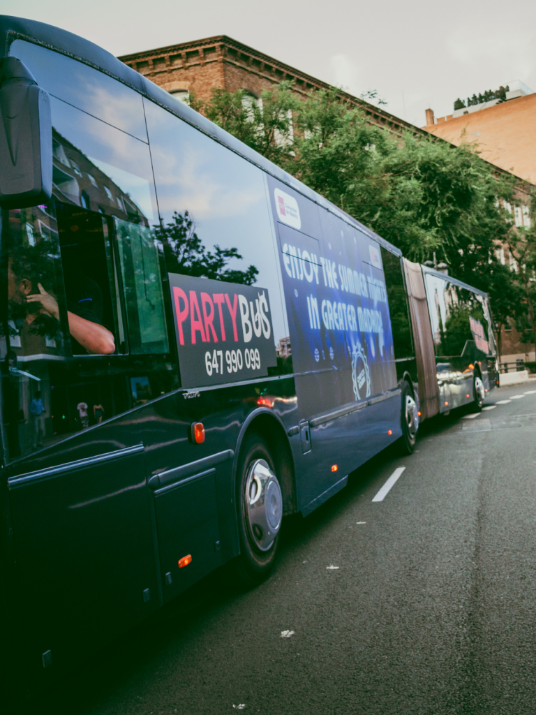 Este 2025 marca un nuevo hito: PARTYBUS se convierte en un soporte publicitario en movimiento. Las marcas pueden ahora anunciarse en su panel gráfico exterior, generar contenido dentro del vehículo o utilizarlo como espacio para presentaciones, rodajes y experiencias a medida. Ya han colaborado marcas como Red Bull, Universal Music, Goiko o Pernod Ricard, que ven en el bus una oportunidad para conectar con su audiencia desde la calle, sin filtros ni algoritmos.